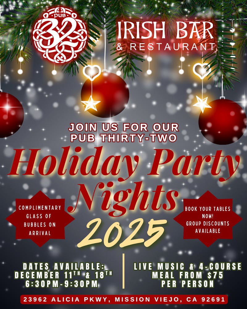 Celebrate the season with style and cheer at Pub Thirty Two’s Holiday Party Nights! Mark your calendar for either Thursday, December 11th or Thursday, December 18th, and join us at our warm and welcoming Irish bar and restaurant in Mission Viejo for an unforgettable evening.